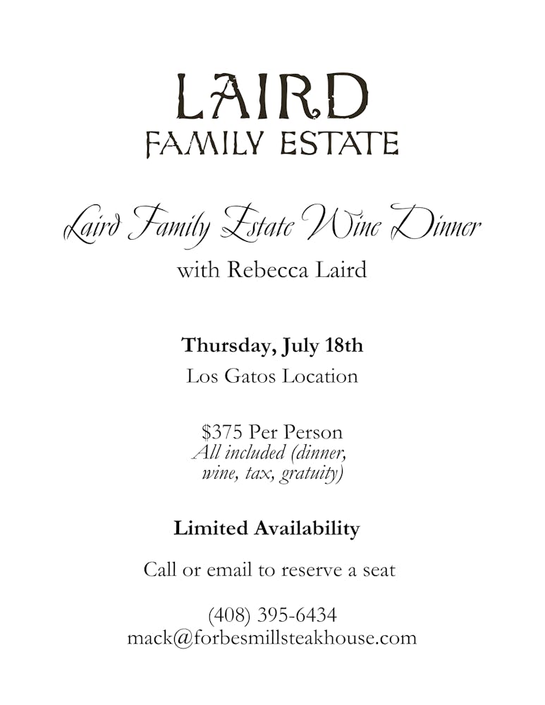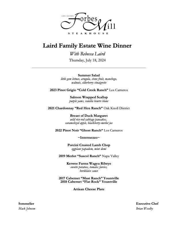 Join us at Forbes Mill Steakhouse in Los Gatos for an exclusive wine dinner featuring Laird Family Estate. Executive Chef Brian Weselby has crafted a special menu to complement the distinctive flavors of Laird's vintages.